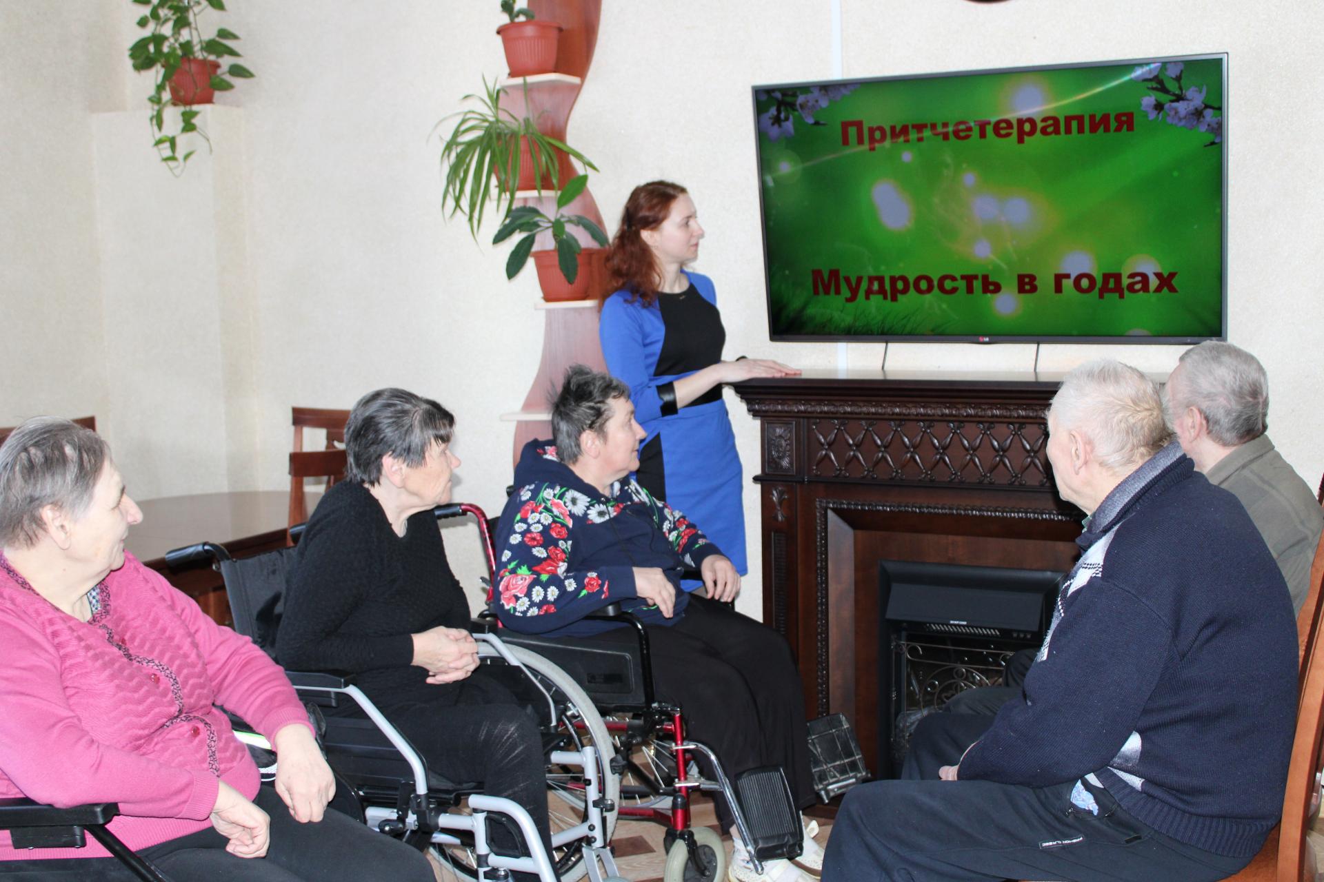 16 марта 2020 года в Пансионате г.Мурома в рамках социально-психологической программы «Мир позитива» состоялся сеанс притчетерапии «Мудрость в годах» для профилактики и коррекции нарушений эмоционально-личностной сферы. Получатели социальных услуг при прослушивании этих небольших поучительных рассказов, в которых содержится вековая мудрость поколений и философские размышления, активно вступали в беседу-рассуждение. Яркие иллюстрации притч «О кувшине и воде», «Цветок и ветер», «Будь счастлив!» помогли участникам мероприятия обрести уверенность в своих силах и восстановить душевное равновесие.