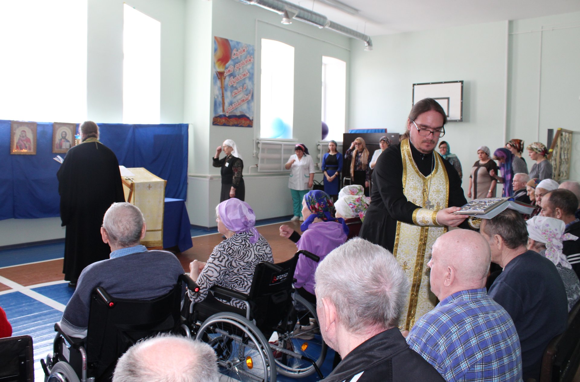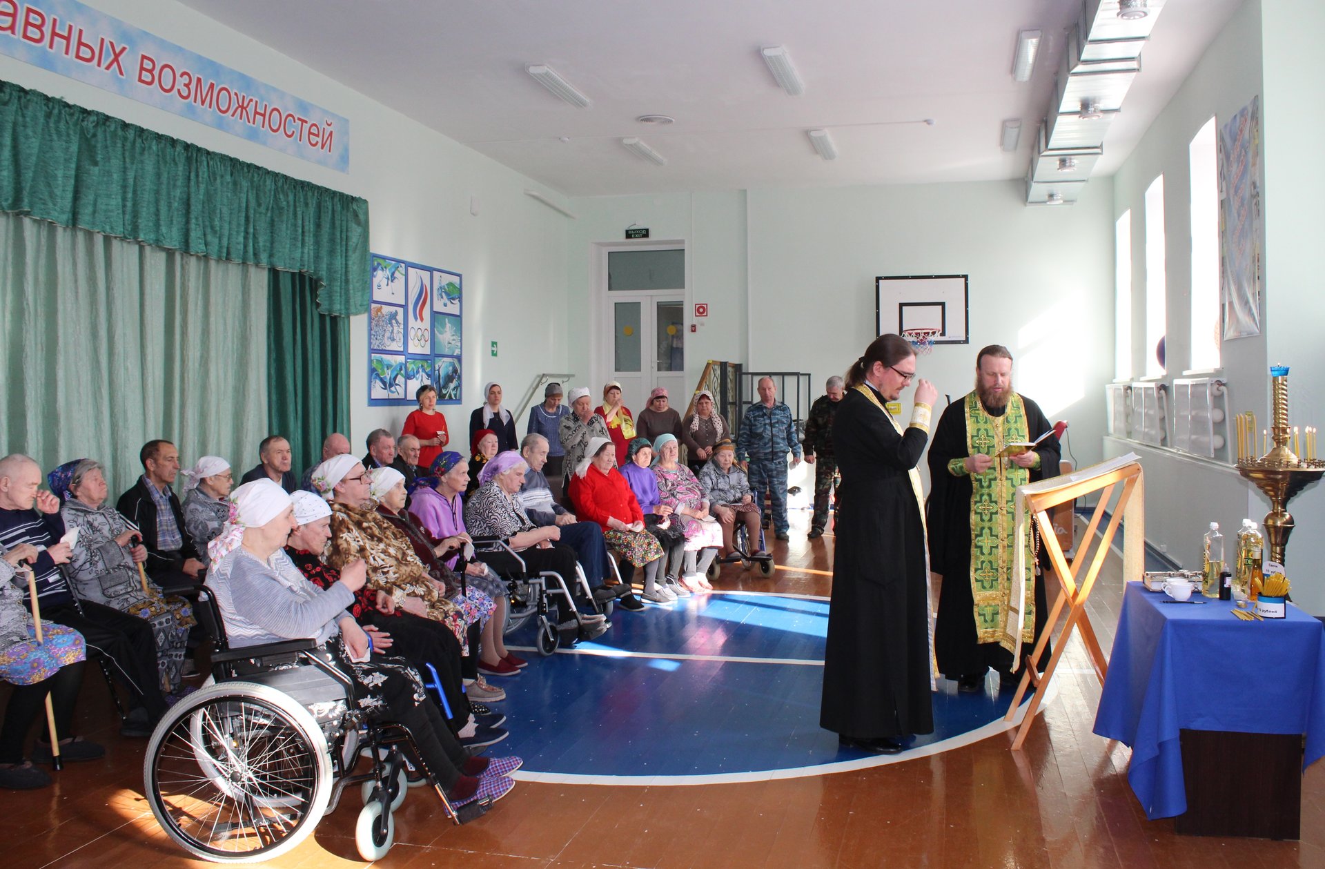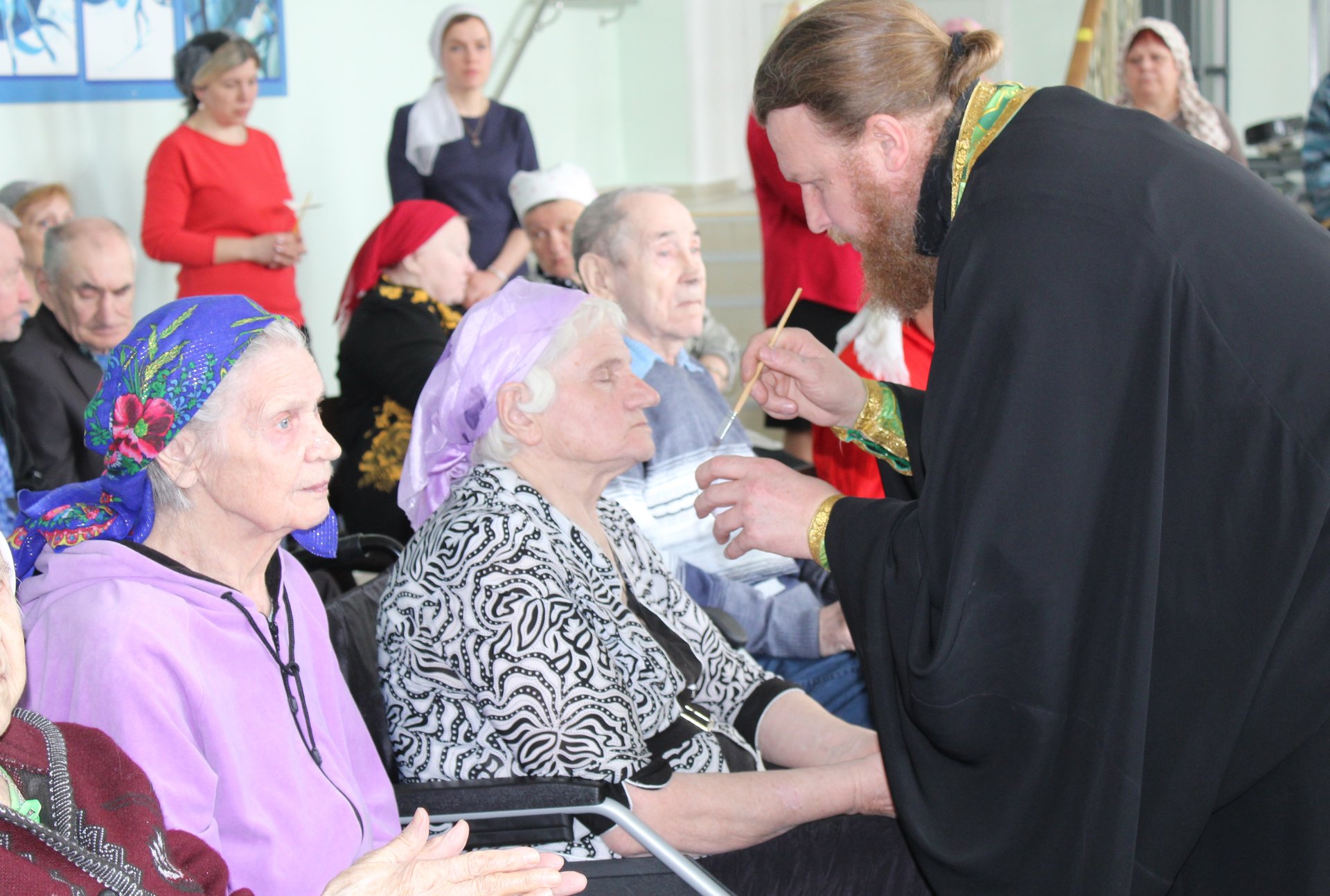 4 апреля 2019 года в часовне «Всех святых» при Пансионате г.Мурома по благословению председателя Епархиального отдела по социальному служению протоиерея Алексия Вилкова совершено Таинство Елеосвящения (Соборования). По сложившейся традиции, во дни Великого Поста, в социальном учреждении совершилось общее Таинство Елеосвящения для сотрудников и получателей услуг. Таинство совершили иерей Вячеслав Чернецов, секретарь Епархиального отдела по социальному служению, и иерей Роман Смирнов, клирик Свято-Троицкого женского монастыря г.Мурома. Сестры милосердия Муромского сестричества Святой праведной Иулиании Лазаревской пообщались с подопечными на различные духовные темы.