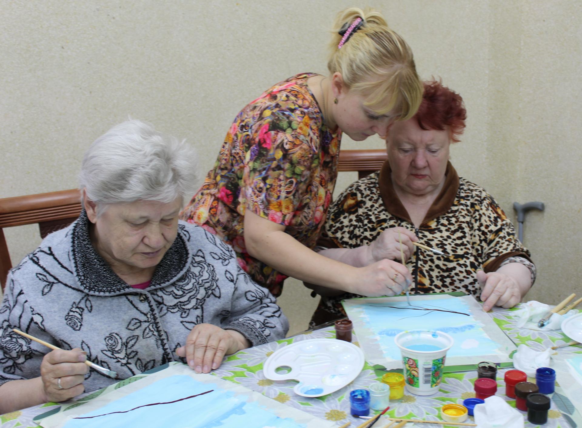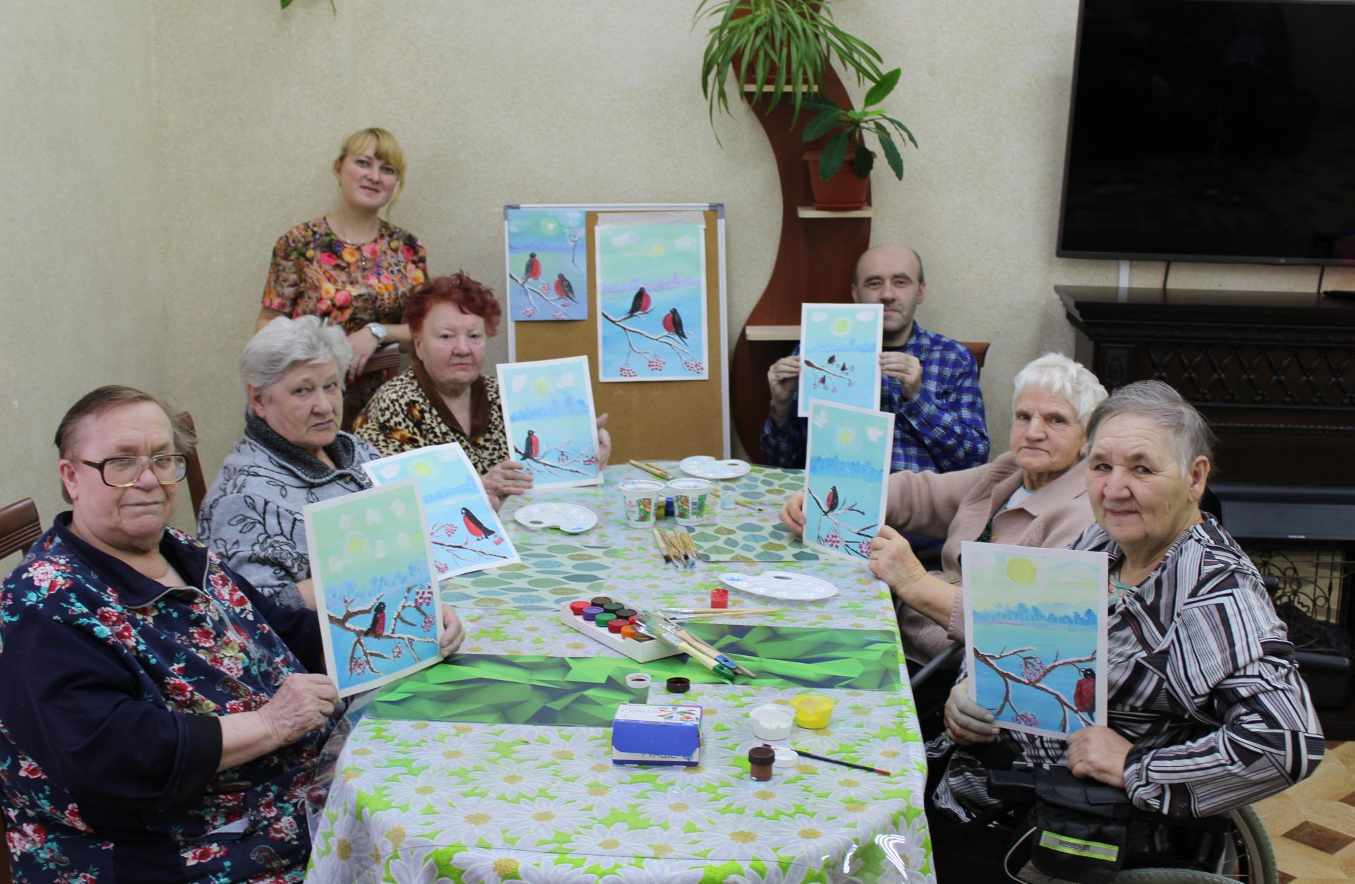 13 февраля 2020г. в Пансионате г. Мурома прошел мастер-класс по рисованию в правополушарной технике. Для гармонизации внутреннего состояния и хорошего настроения, вооружившись кисточка и красками и погрузившись в атмосферу творчества, получатели социальных услуг рисовали снегирей. Красногрудые пташки на припорошенной снегом рябинке добавят яркости в ненастный зимний день.